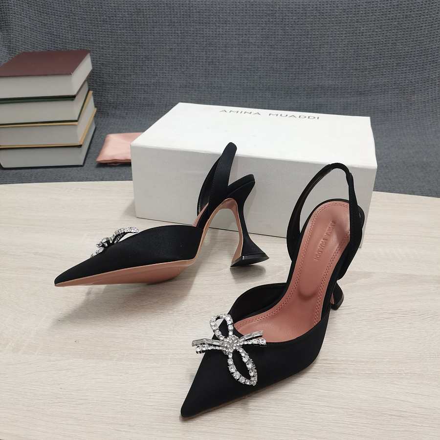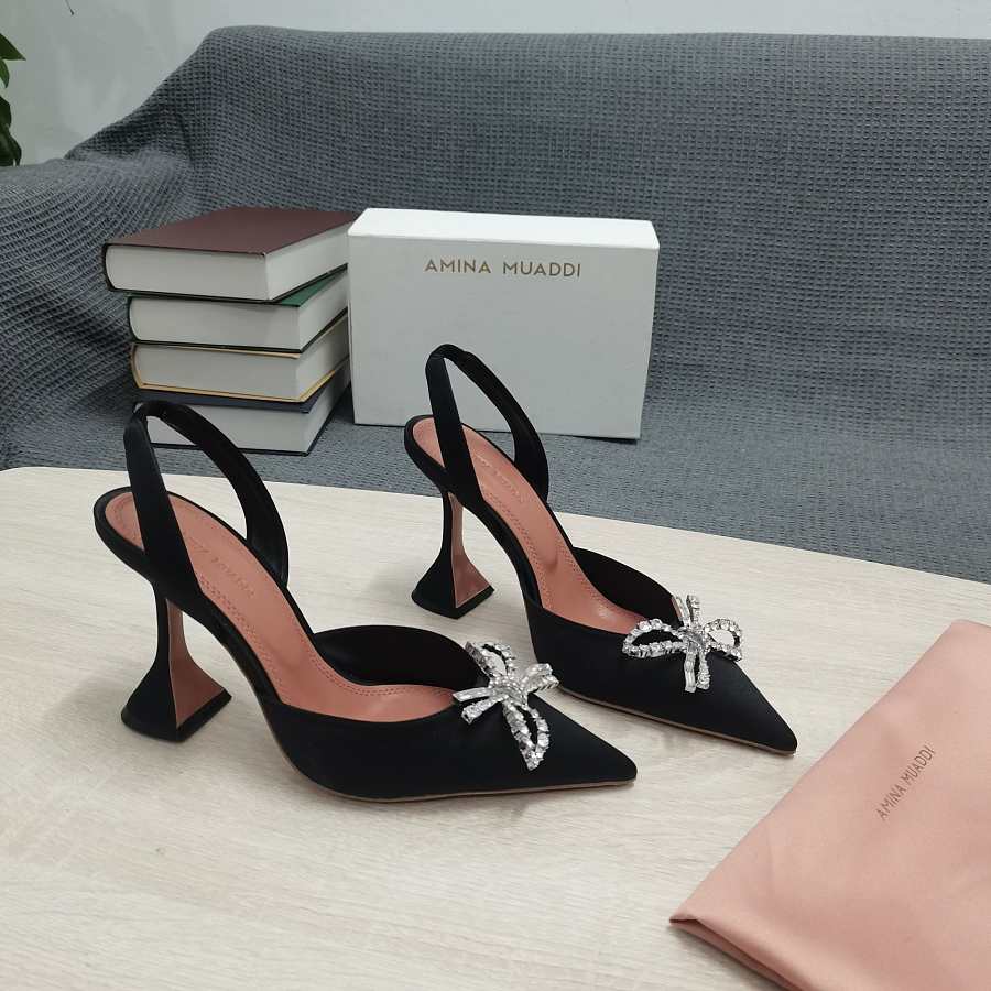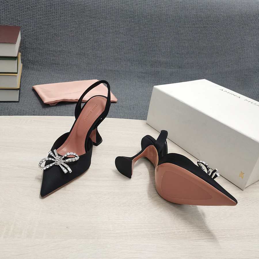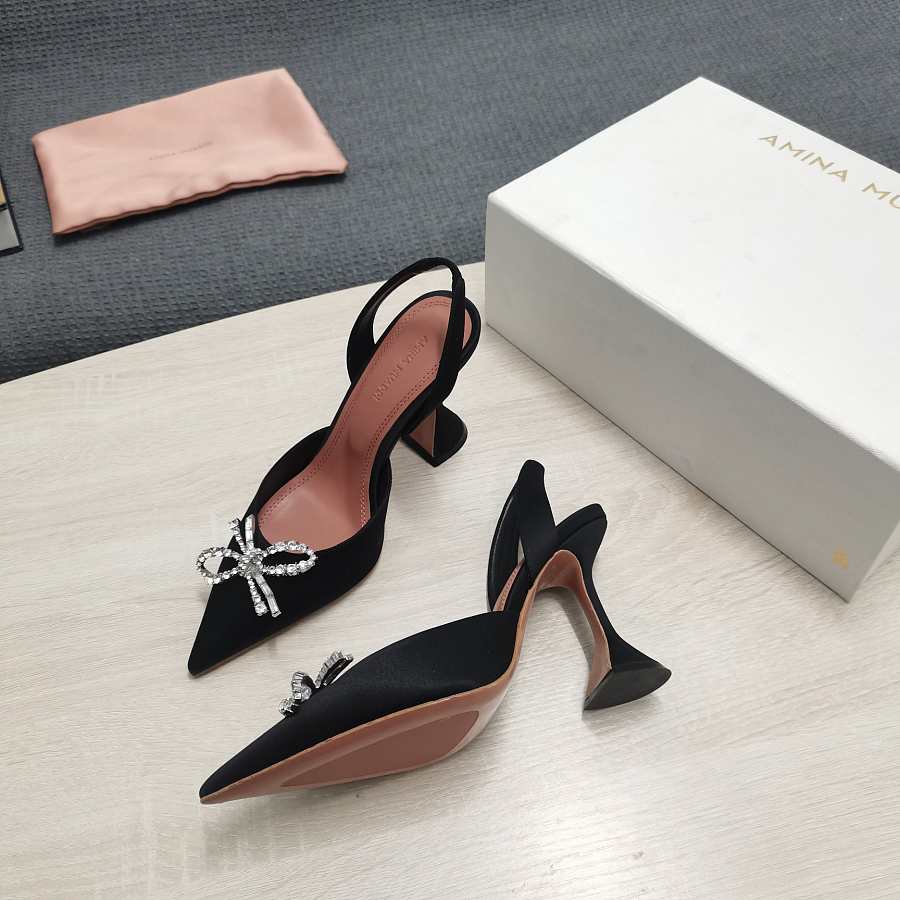 AMINA MUADDI Black satin pumps crystal bow